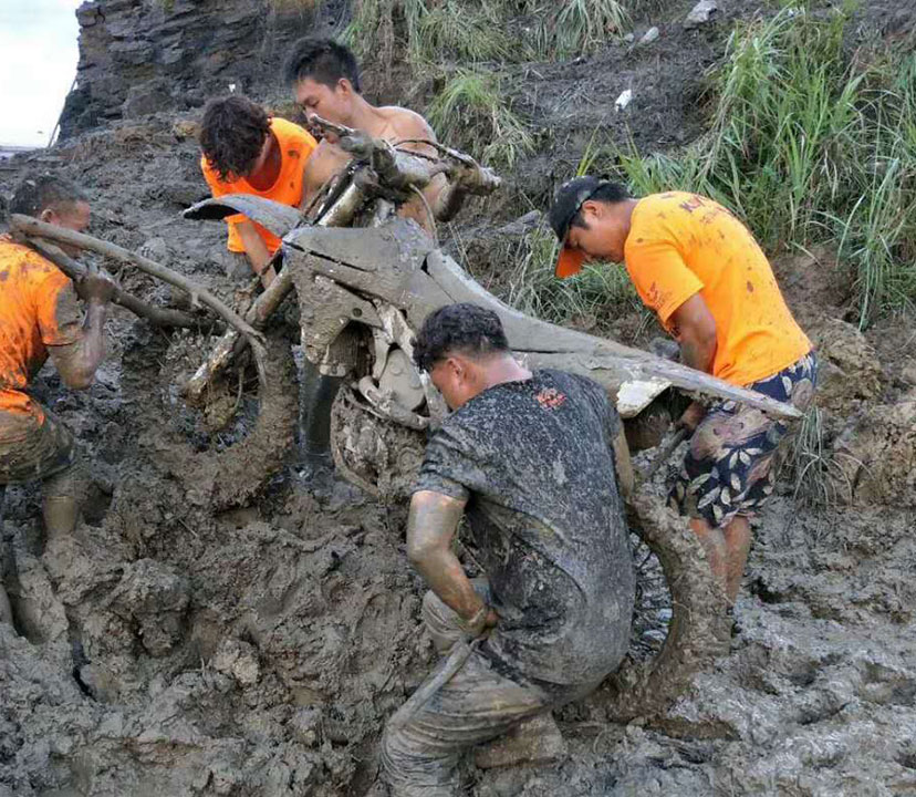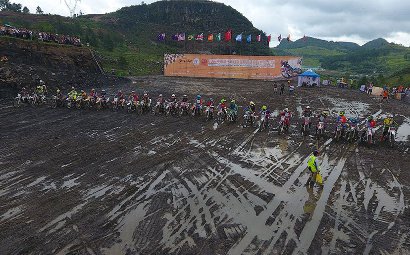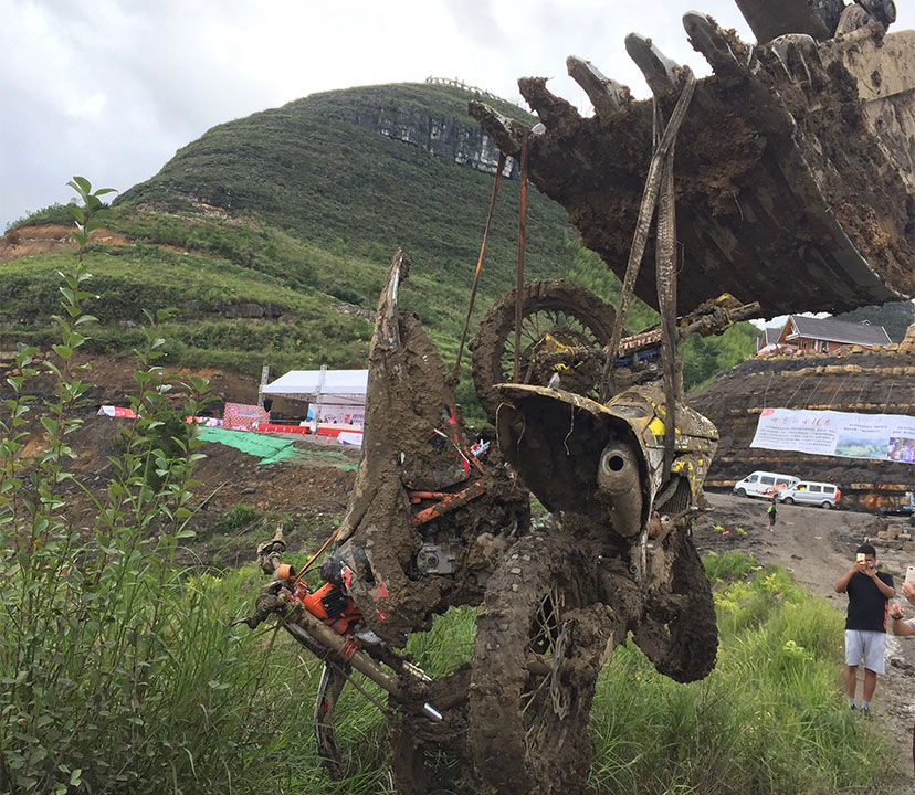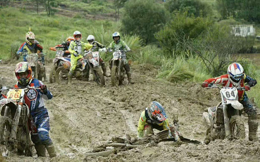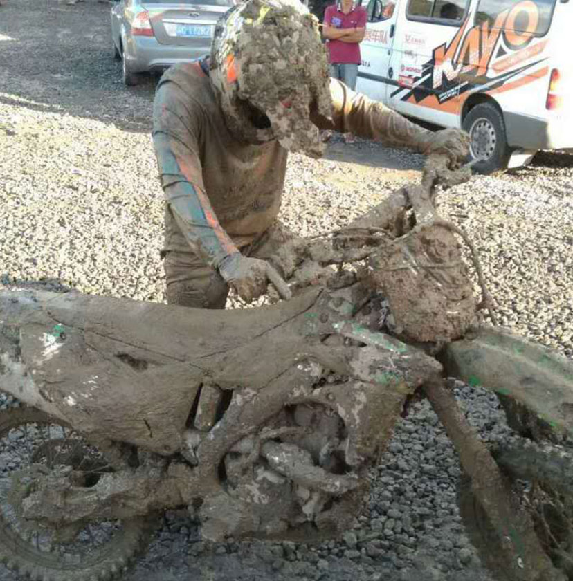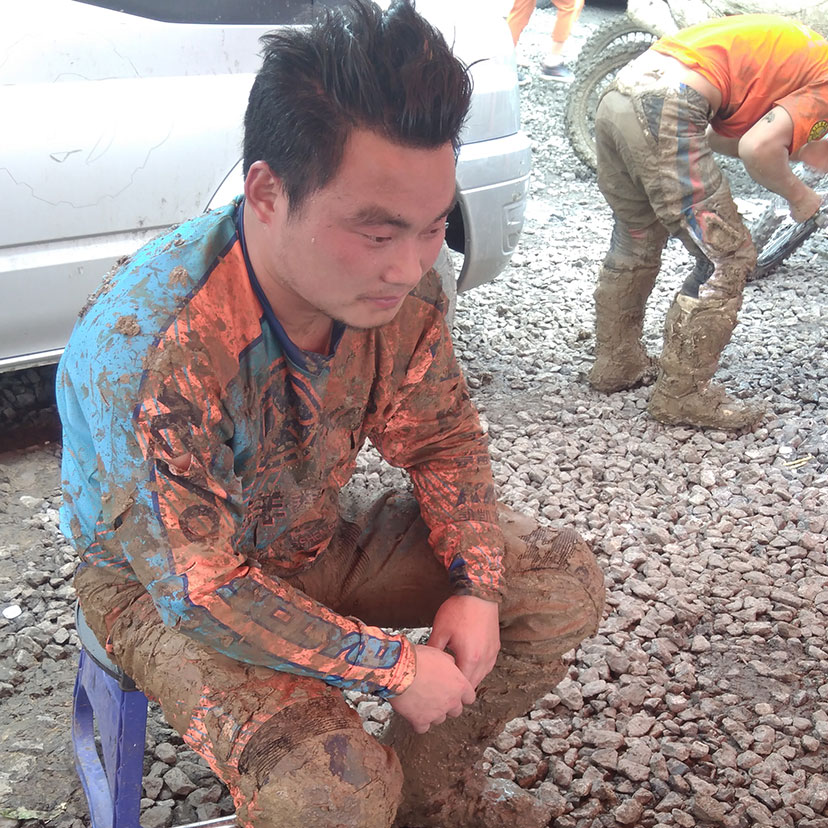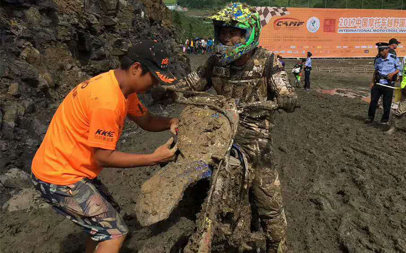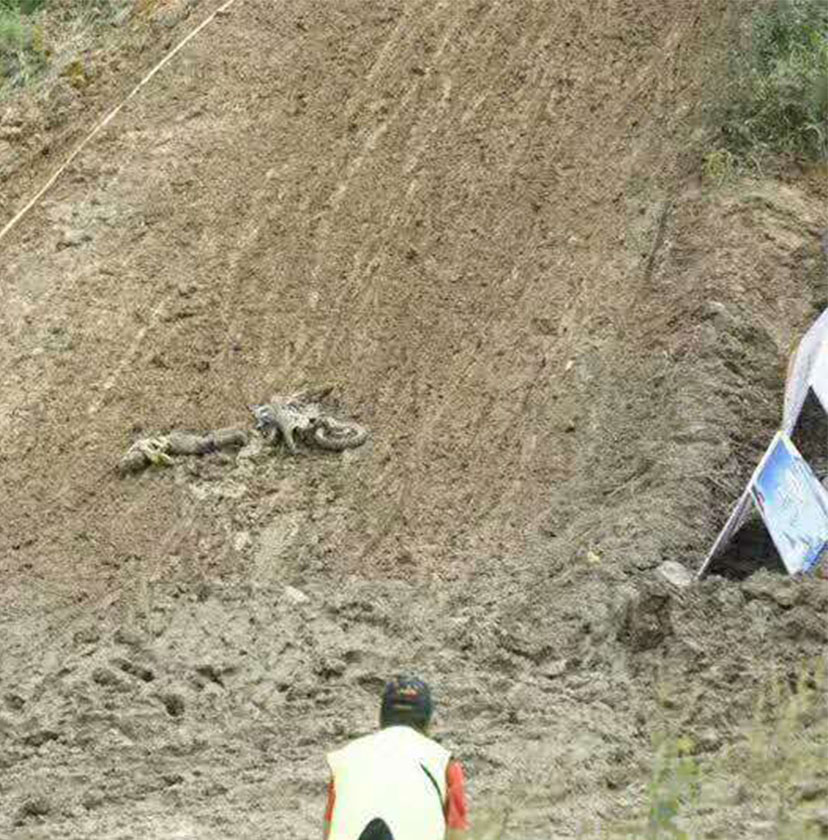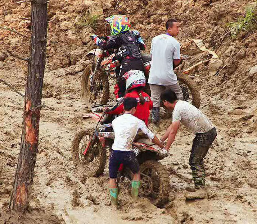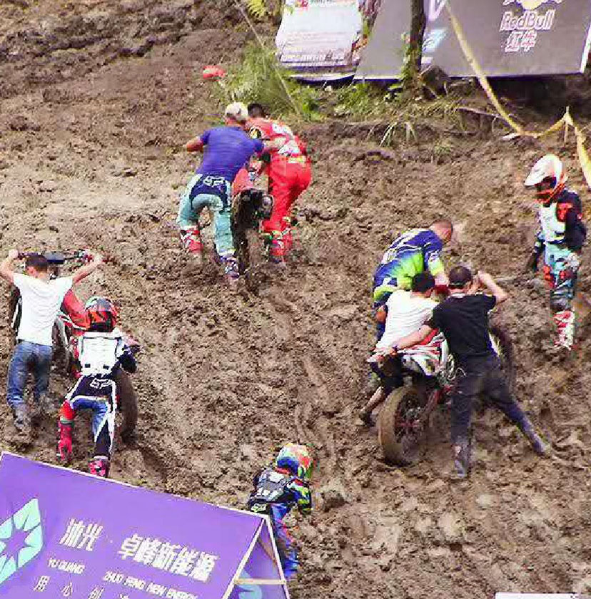 由于8月進(jìn)入雨季,而賽道又較低排水困難,比賽前一夜的暴雨讓整個(gè)賽道變得格外的泥濘濕滑。泥濘的場(chǎng)地是最考驗(yàn)車手的體能的,摔車,推車避免不了,看看下面的圖片,車友們就知道比賽的車手們會(huì)多消耗體能。參賽選手眾多,能堅(jiān)持完賽的寥寥幾無,車手能夠取得成績(jī)是相當(dāng)不容易。